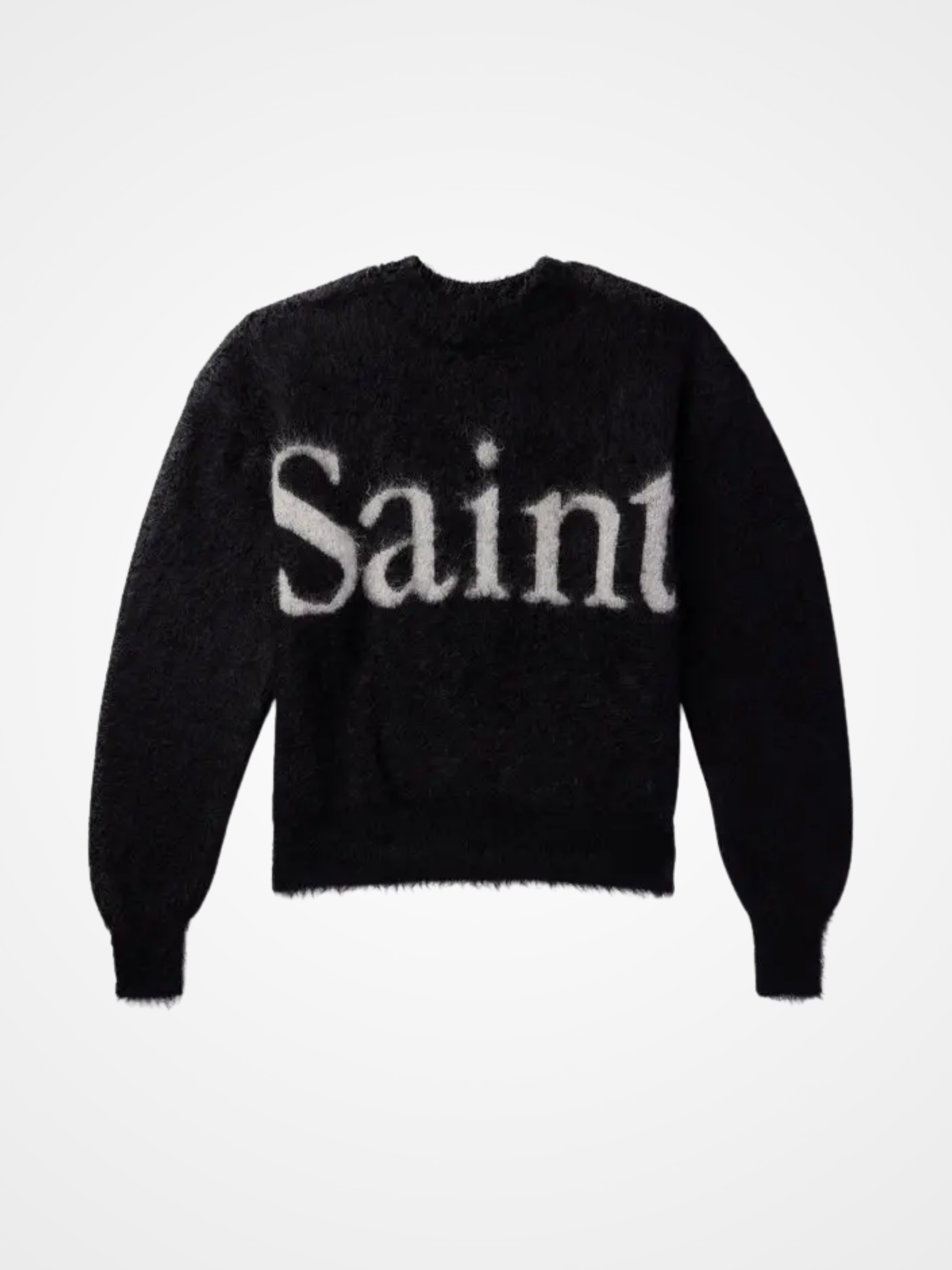 This vintage-inspired sweater is made from a soft mohair-blend (55% mohair, 30% nylon, 15% wool) and features a bold serif-style jacquard knit across the front, giving it a logo-inspired streetwear edge.
