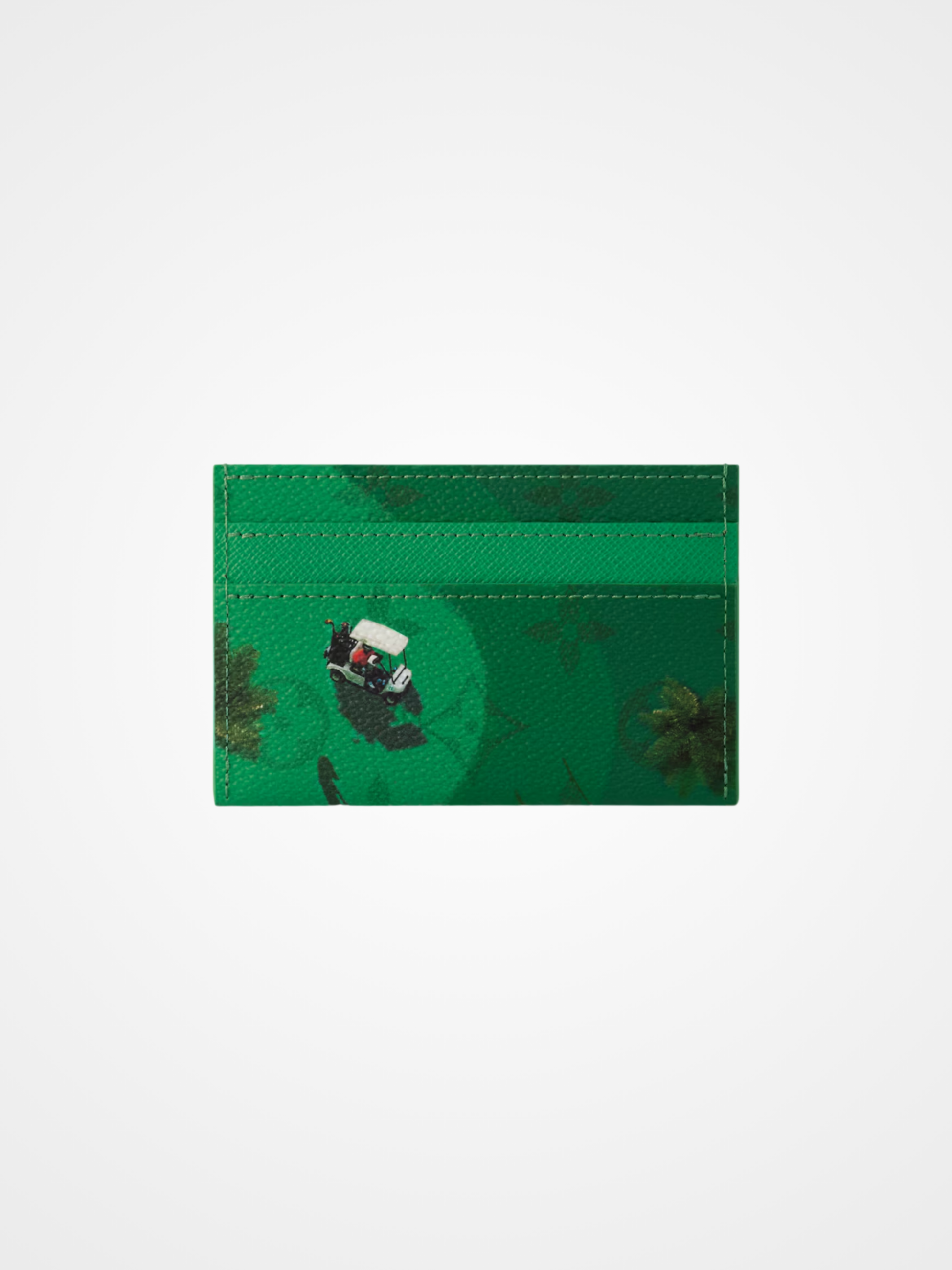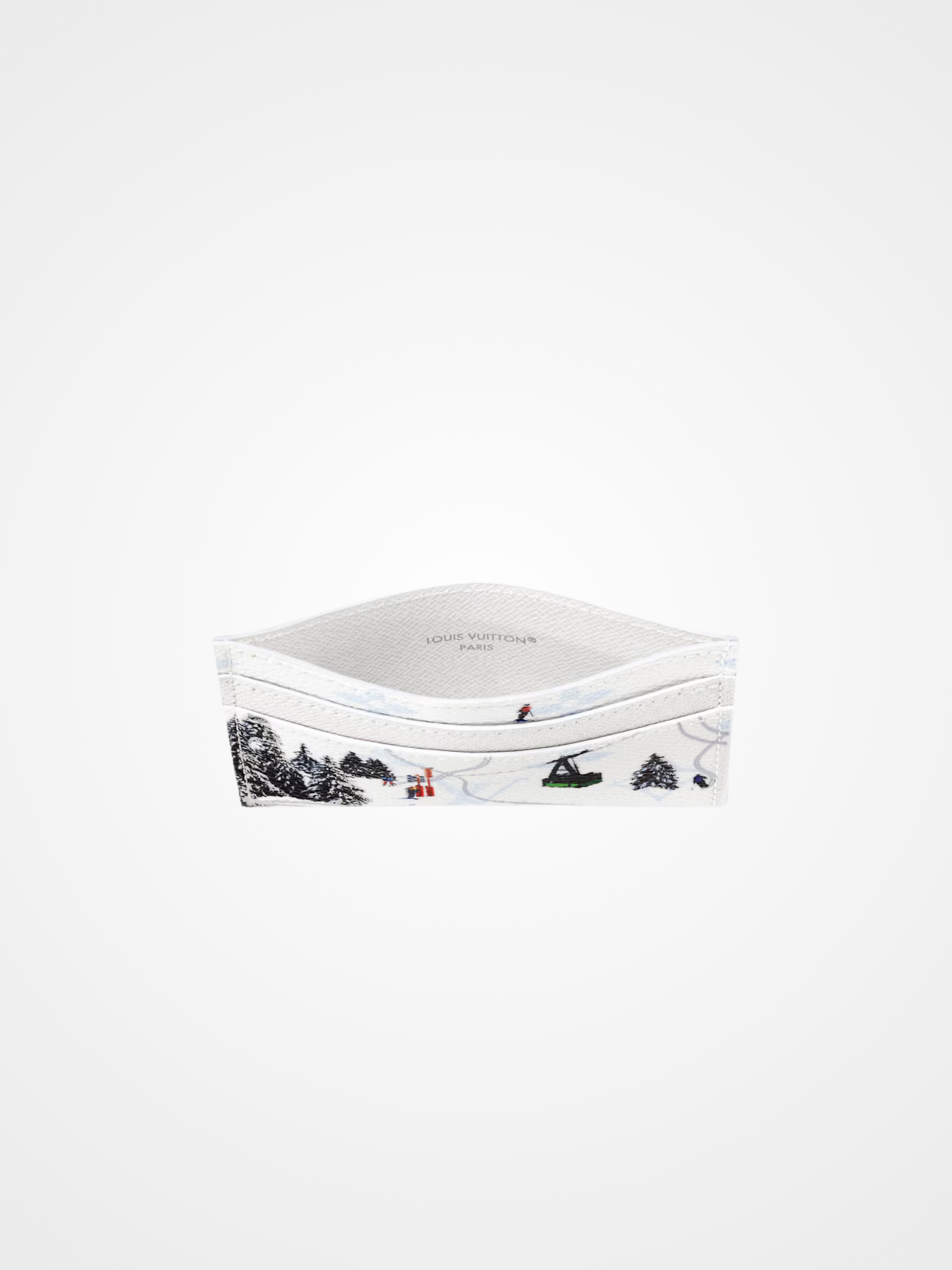 The Double Card Holder is crafted from colored Monogram canvas, featuring a print of a miniature sports scene. The playful image adds a whimsical touch to this classic accessory. The interior is lined with cowhide leather and offers four card slots along with a central pocket for smaller essentials.