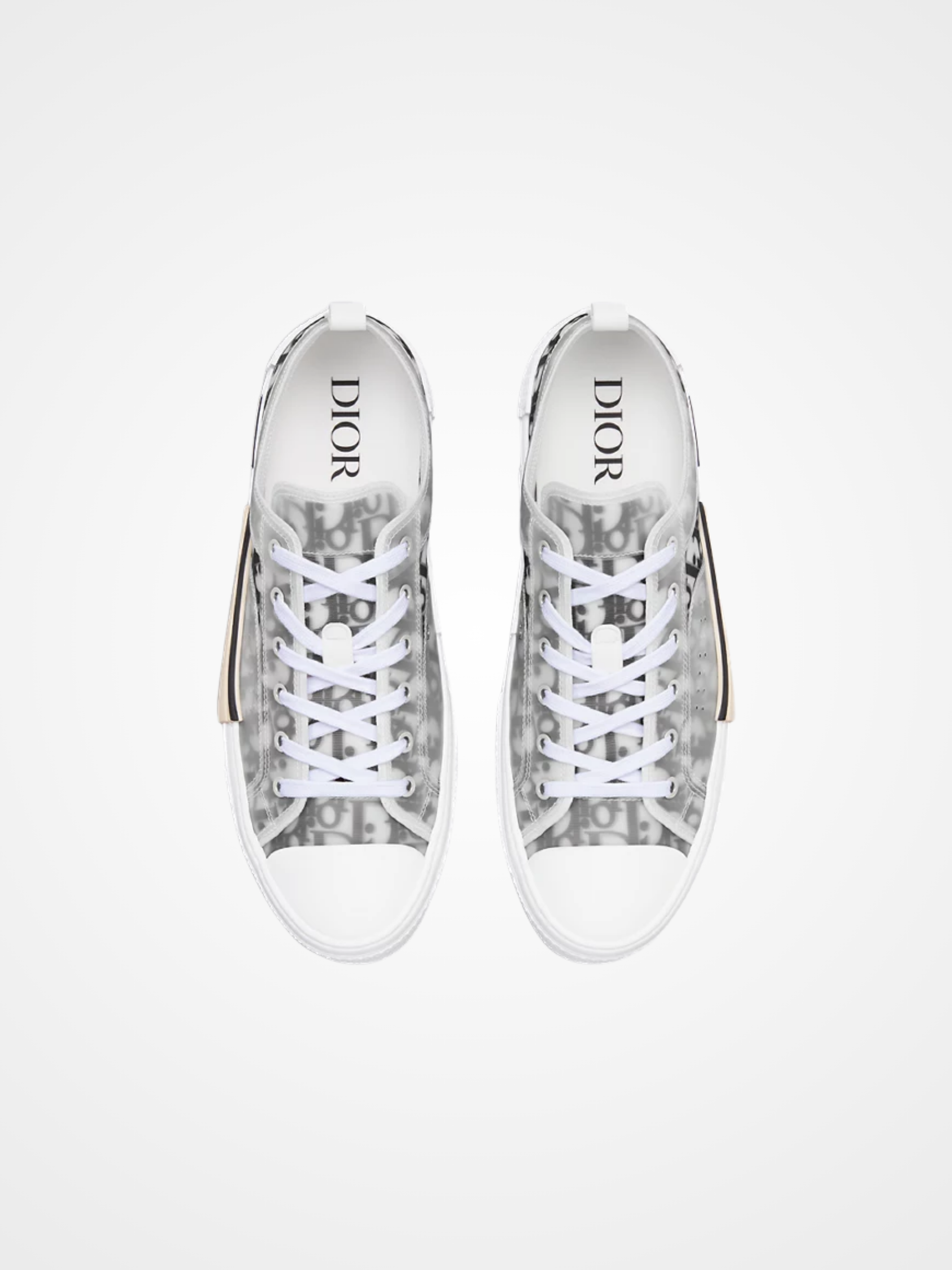 The League low-top sneaker is set apart by its layering of transparent paneling and white and black Dior Oblique canvas. Essential details, such as eyelets and a lace-up front, a white and beige rubber sole, a rounded and reinforced toe as well as a rear tab recall the codes of the classic low-top style. The sneaker is further enhanced by contrasting details on the sides, including a Dior signature, and will pair easily with any casual outfit.