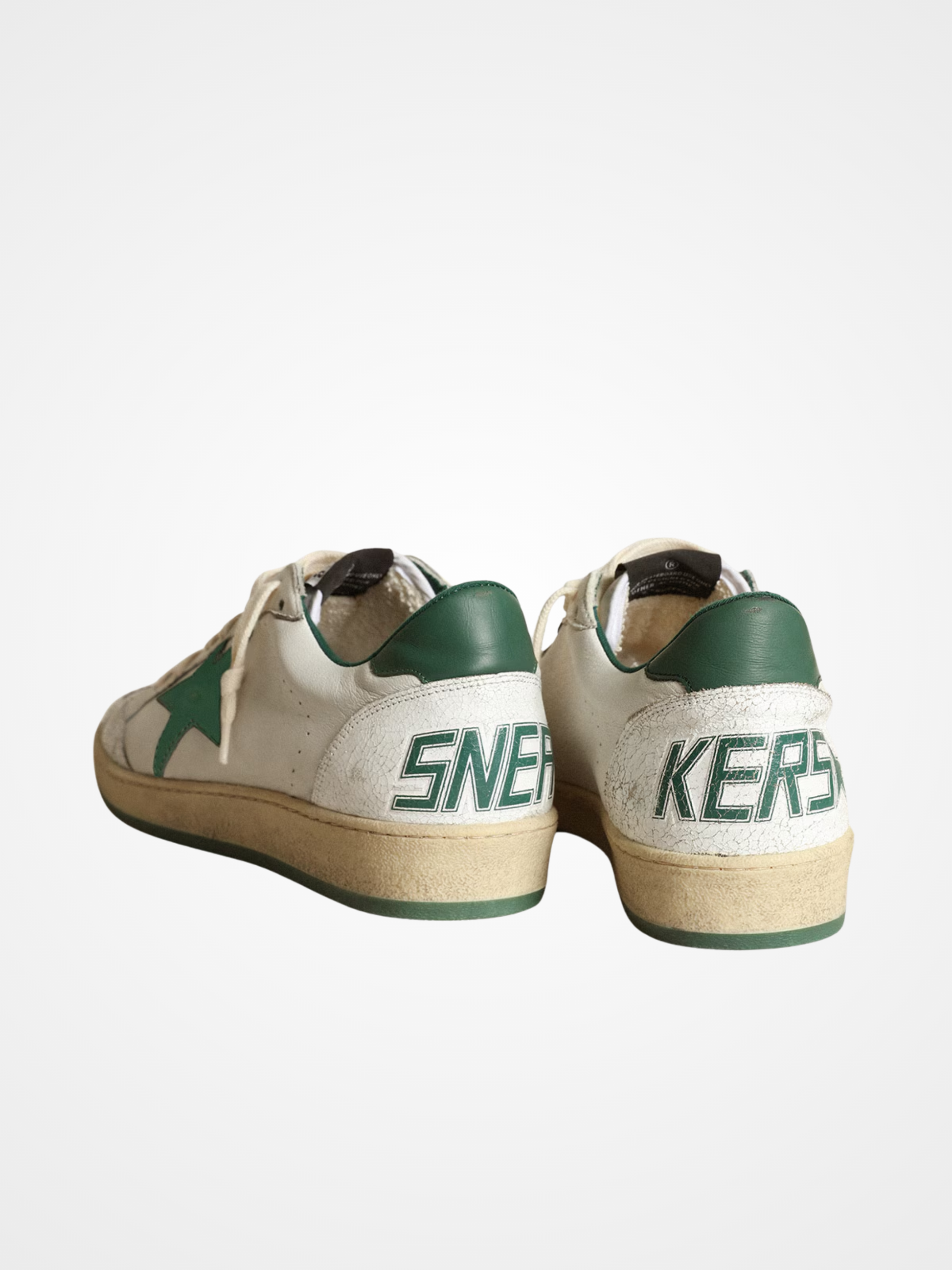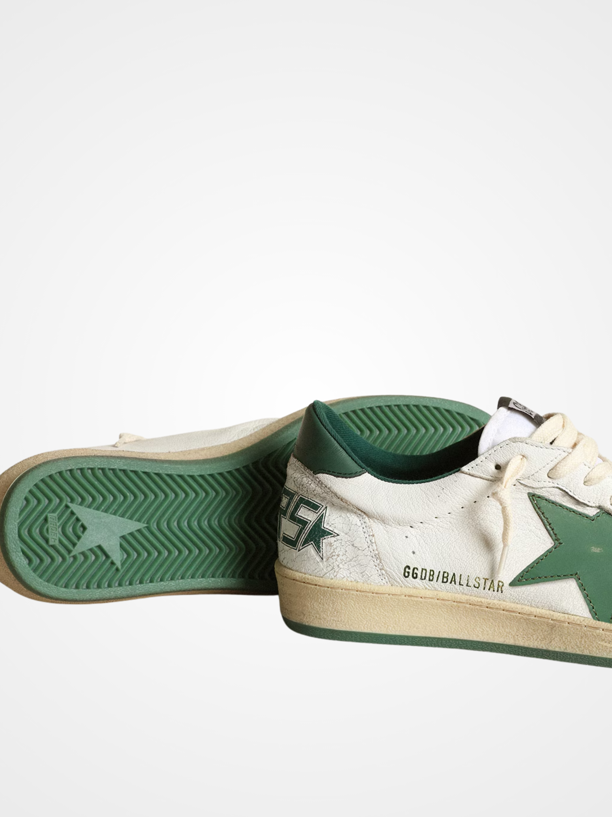 Inspired by the 80s American college atmosphere, this Ball Star features the wording Good Luck in green on the heel. This women’s model, with a white nappa leather upper, stands out owing to its green star and white crackle leather details, such as the toe and the insert on the back.