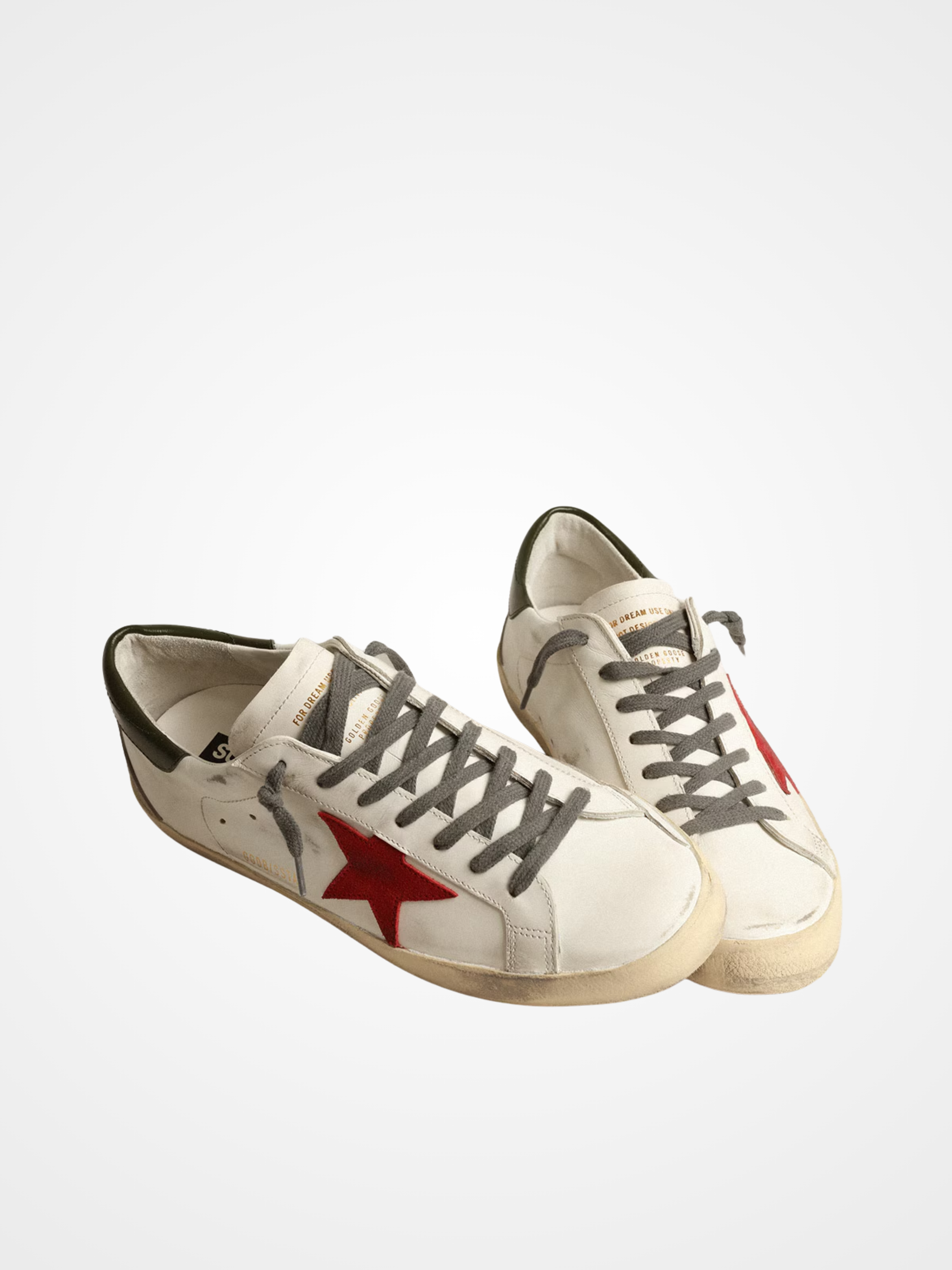 A timeless icon yet one that’s constantly evolving. At Golden, we love taking our classics and reworking them all the time, always from a new angle. These Super-Star with a white leather upper feature a red suede star and dark green leather heel tab. The ice-gray suede insert on the back and gray laces add the finishing touch.