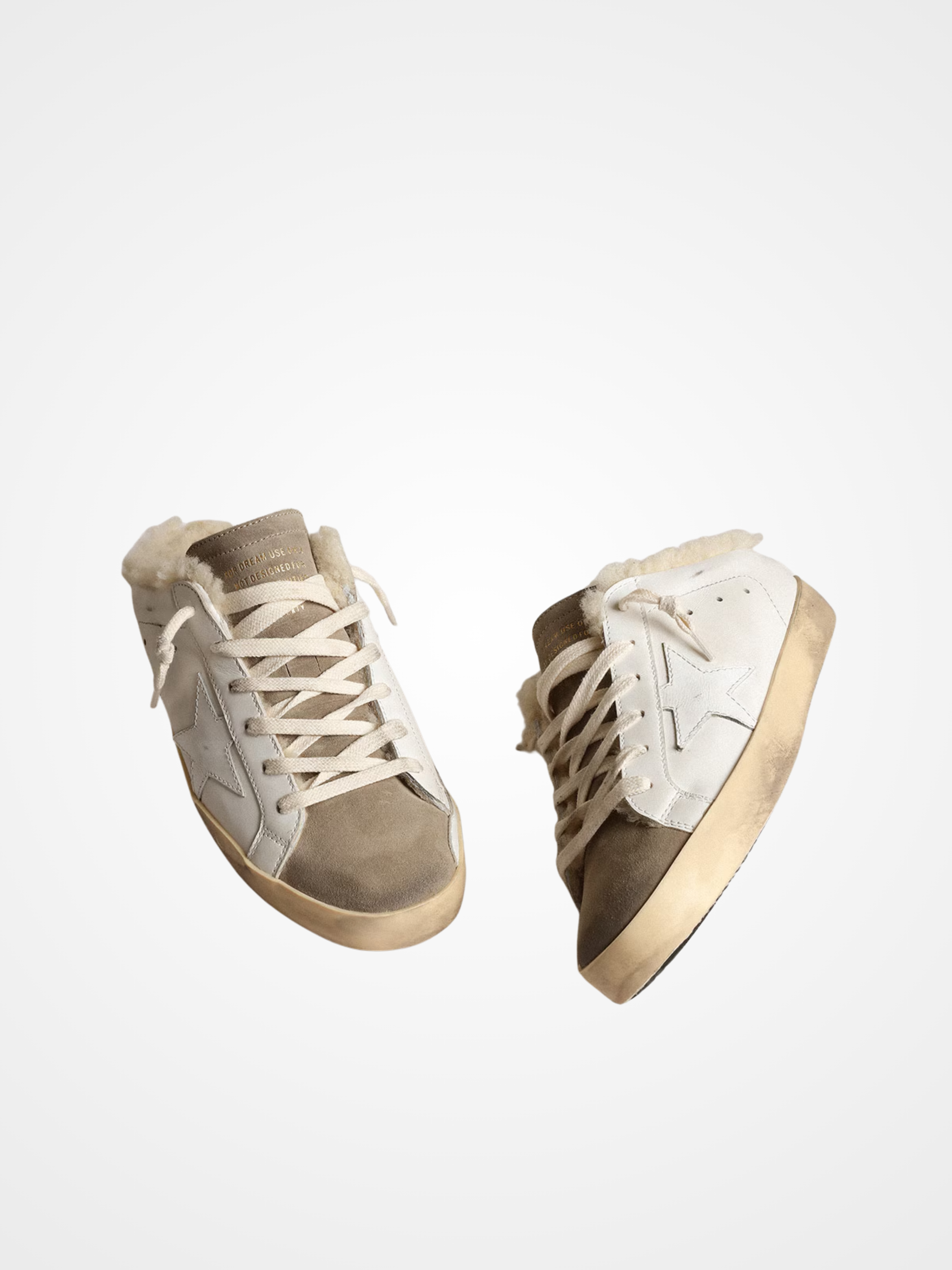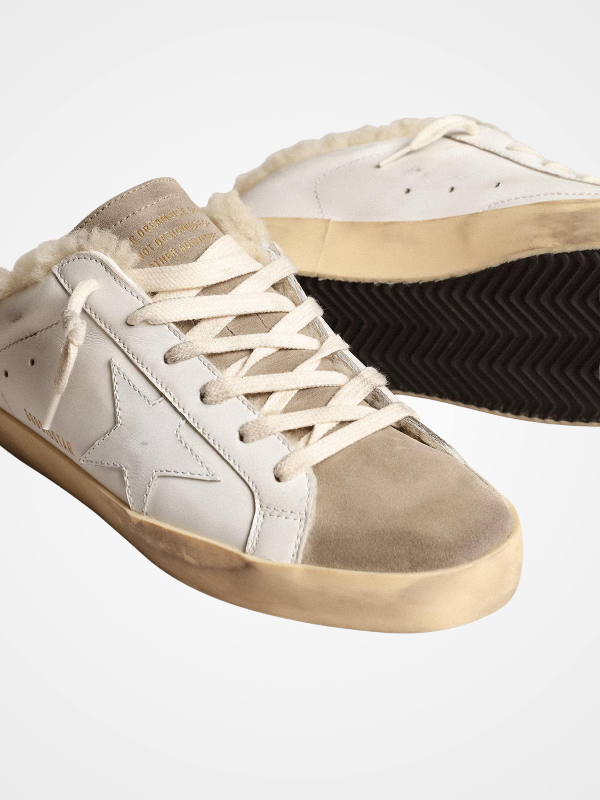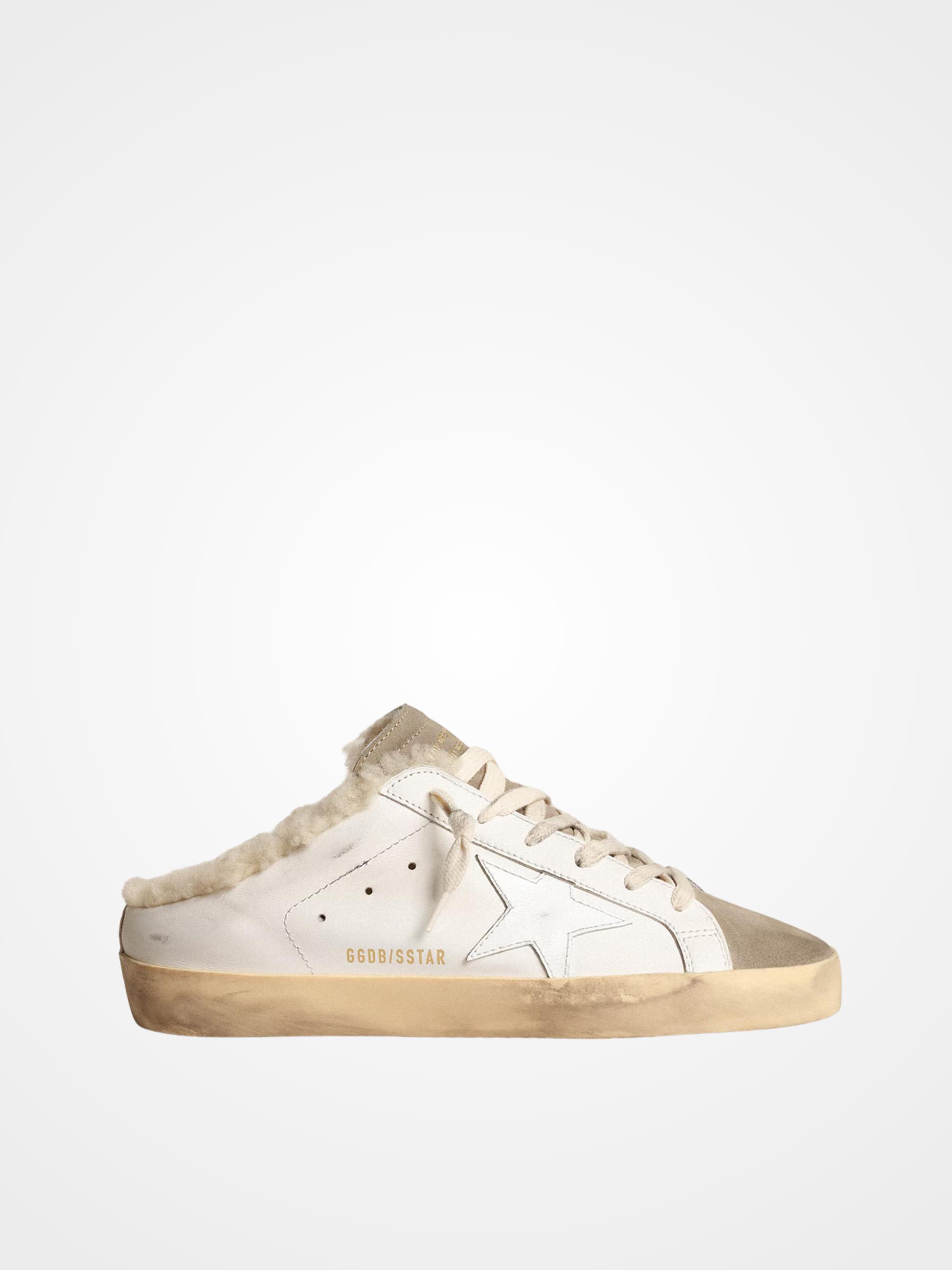 A timeless icon yet one that’s constantly evolving. At Golden, we love taking our classics and reworking them all the time, always from a new angle. Lined in soft beige shearling, this sabot version of our Super-Star sneakers in white leather features a glossy white leather star and a dove-gray suede tongue. And cream-colored laces add the finishing touch.