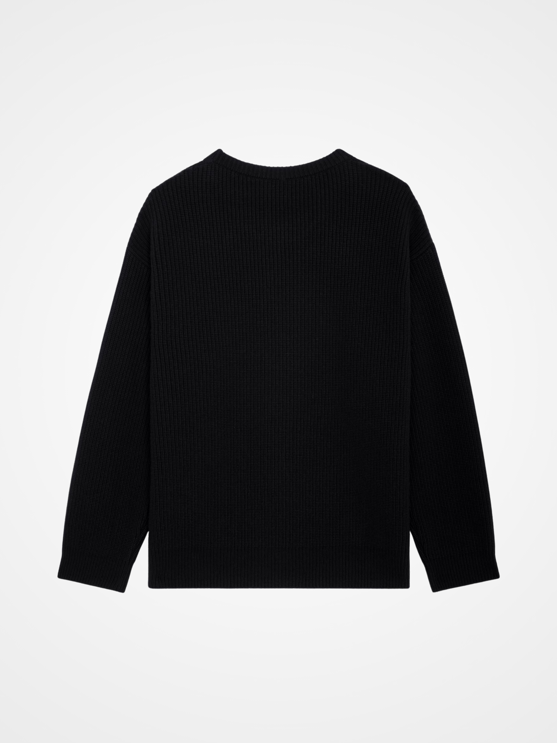 This oversized crew-neck sweater is crafted from ribbed wool, offering both warmth and texture. It features a subtle patch inspired by Celine branding, blending relaxed comfort with understated luxury for a modern, versatile look.