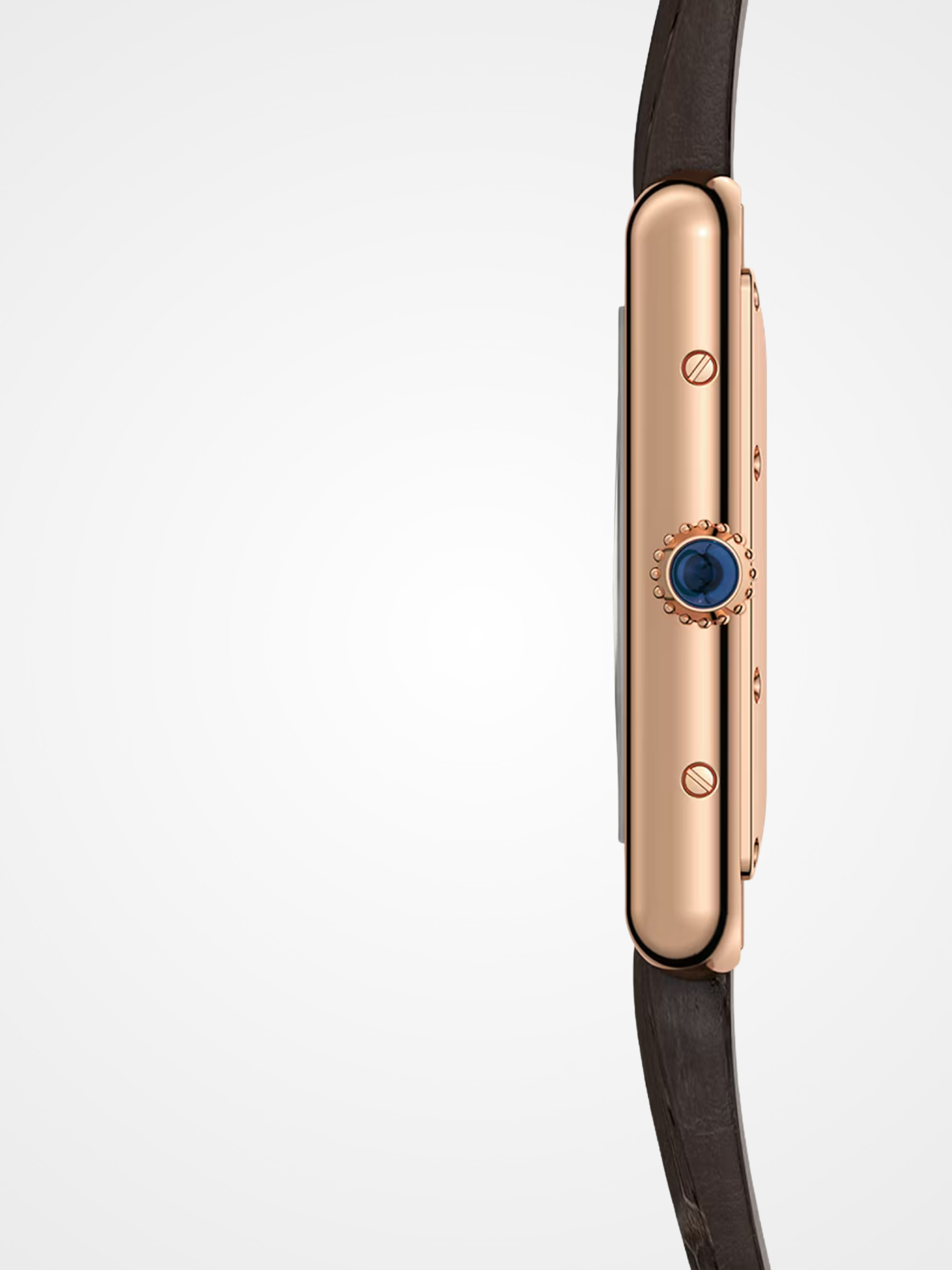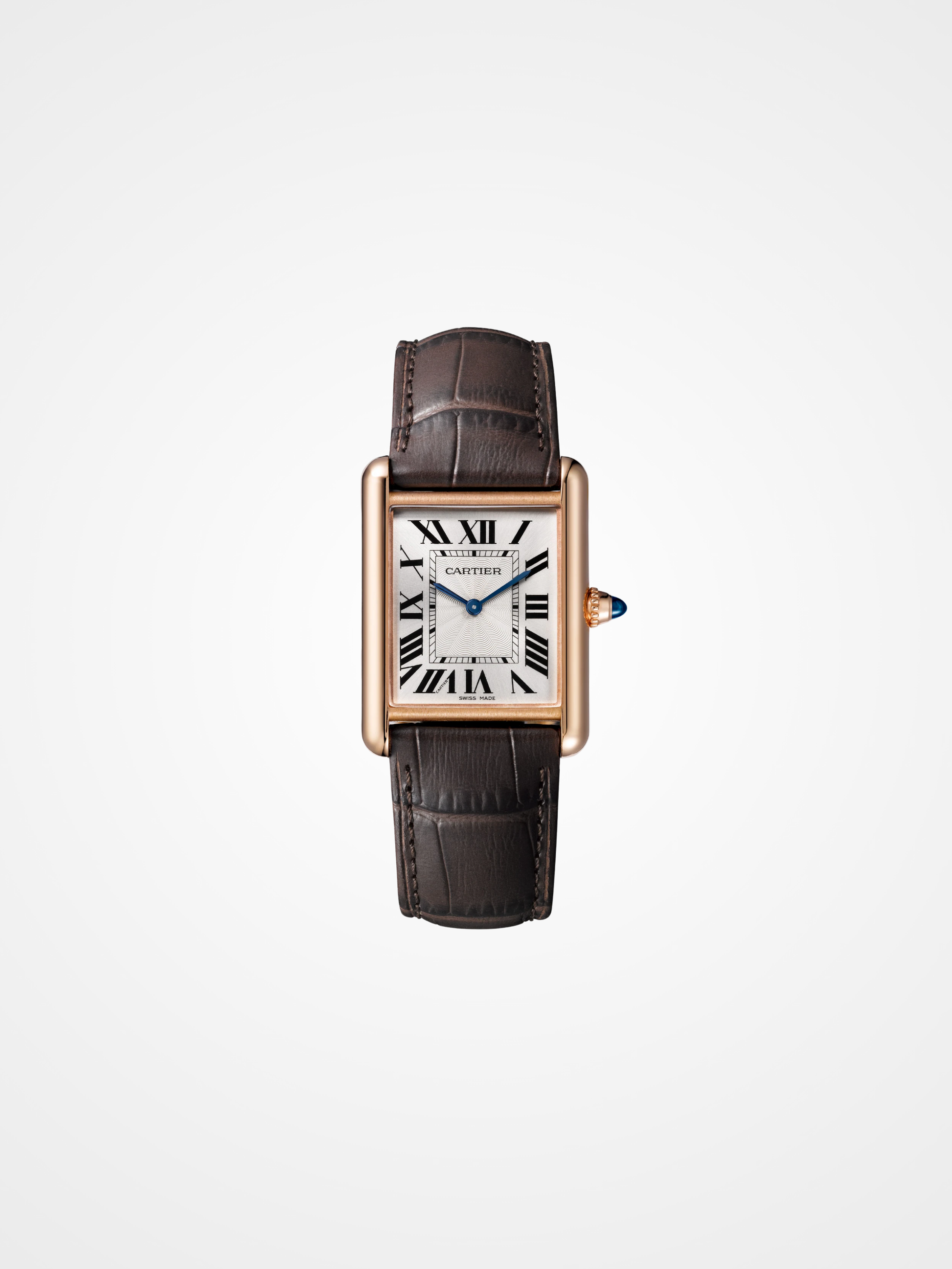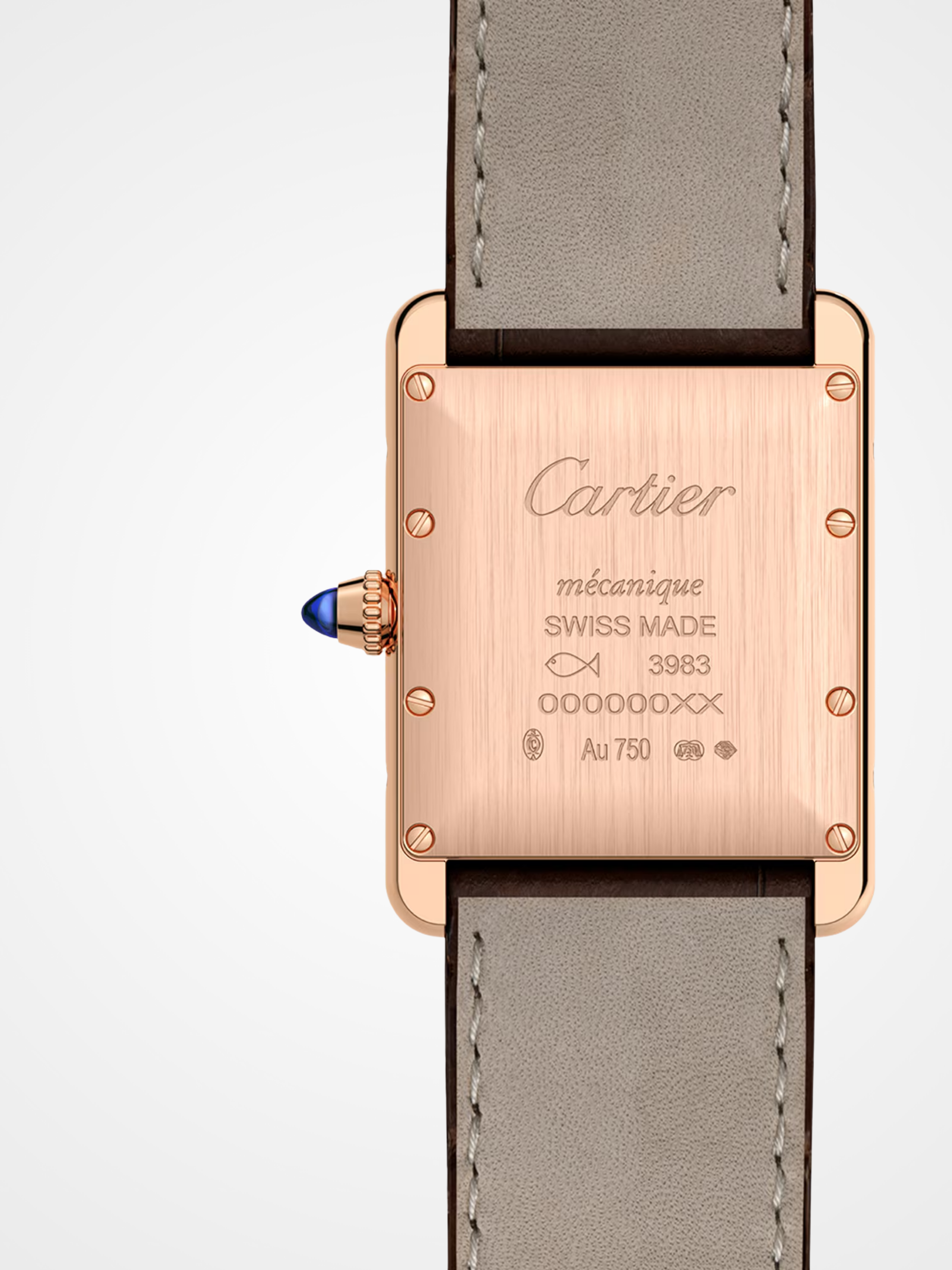 The Tank Cortier Watch epitomizes timeless elegance and refined craftsmanship. Featuring a mechanical movement with manual winding, it has a beaded crown with a decorative stone. The dial is complemented by sword-shaped hands and protected by a scratch-resistant crystal.