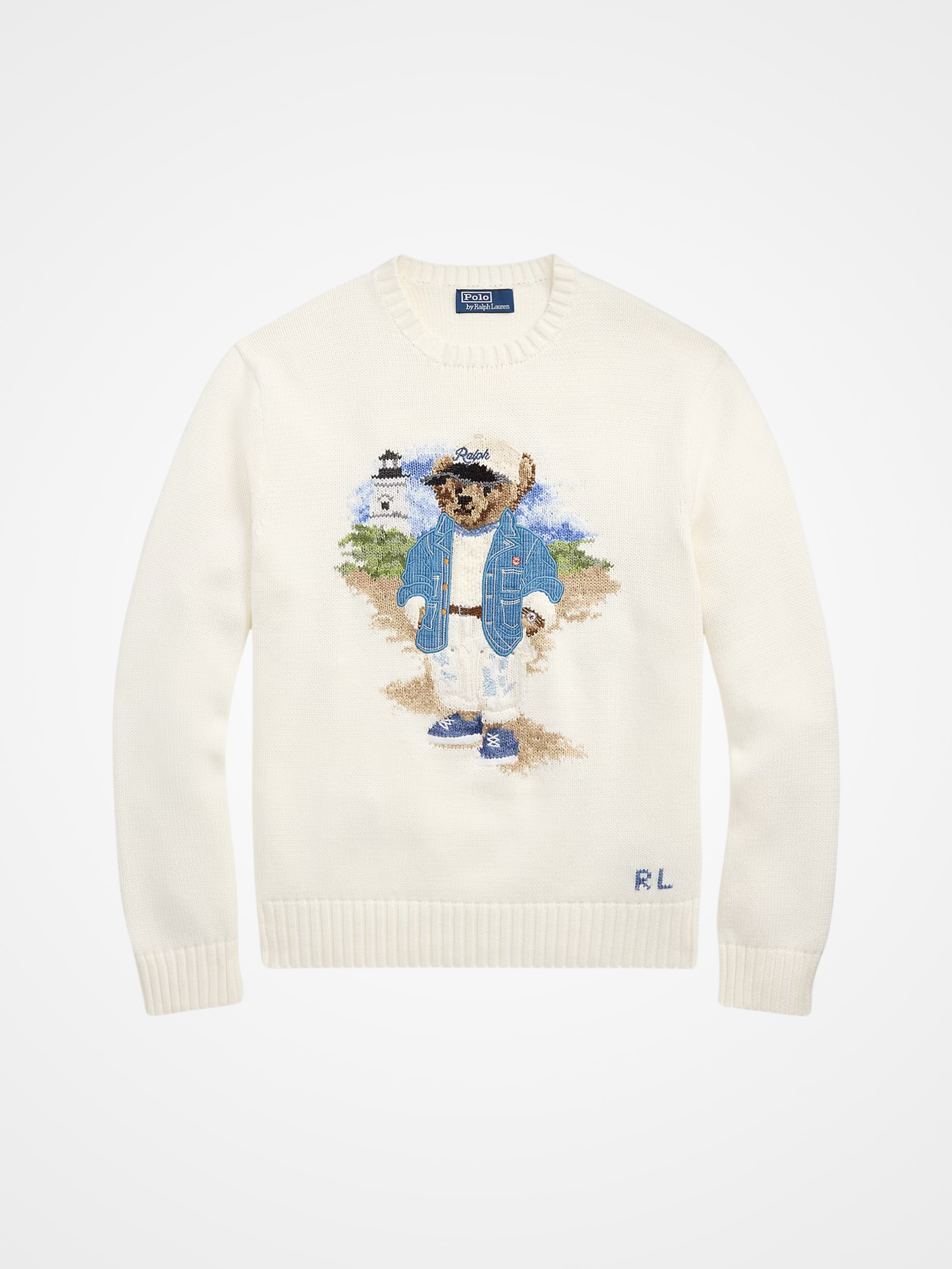 Part of the seasonal collection inspired by the charm and rustic beauty of coastal living, this sweater features a detailed bear motif dressed in layered seaside-inspired attire. Over 25 yarns are used, combined with real chambray on the bear’s jacket, adding rich texture. The left hem is finished with hand-embroidered initials for a subtle artisanal touch.